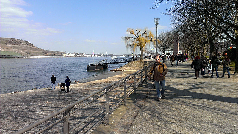 Am Parkplatz “Imbiss am Rhein” in Budenheim stellen wir das Auto ab. Auf dem Radweg Flussabwärts marschieren wir los Richtung Bingen. Die ersten Kilometer ist wieder einlaufen angesagt. Heute zwickelt es weniger im Knochengerüst. Kann auch am Wetter liegen. Es ist fast richtig Frühling. Die Sonne ist noch nicht superwarm, aber man kann schon Farbe kriegen. An Wegmarkierungen haben wir gar nichts zu beachten. Der Weg geht immer geradeaus am Fluß entlang. Viele werden die Stecke kennen.